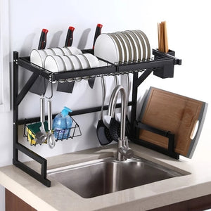 Suport multifunctional pentru uscarea vaselor, poate organiza toate ustensilele, cutitele, furculitele, farfuriile, buretii de spalat vase, capace, fructe, legume. Toate articolele din bucatarie intr-un singur loc.