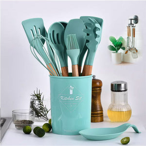 Setul include 12 ustensile pentru gatit confectionate din silicon care se vor potrivi tuturor nevoilor dumneavoastra. Acesta este rezistent la caldura si nu este toxic.