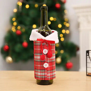 - Husa pentru sticlă + căciuliță are o tematică clasică de Crăciun, cu setul includ un costum cu căciulă și un pompon. Elementele de decor adiționale includ nasturi și blană artificială.